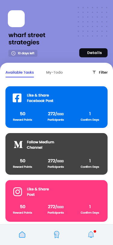 DescriptionMaster Bounty is a White Label solution where different companies will post their social media posts for like, share, comment, and some creative activities like logo creation, web design, brochure creation, etc. and community will participate in that campaign and gain rewards points. Later, they can convert these points in money and make a withdrawal. In this, all the activities will be monitored by BOT. It is a completely automated application where an admin needs not have to sit and manually verify all the user tasks. Our application does this job automatically. Since it is a white label solution For the companies who will register in master bounty and become a member by choosing a membership plan. Then we will verify all the details of the company and approve for posting the campaign from the admin panel. |